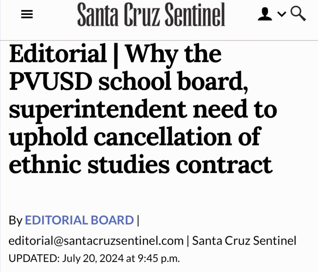 On July 20th, the Santa Cruz Sentinel wrote an editorial supporting the cancellation of the ethnic studies contract with the consulting firm, Community Responsive Education (CRE).