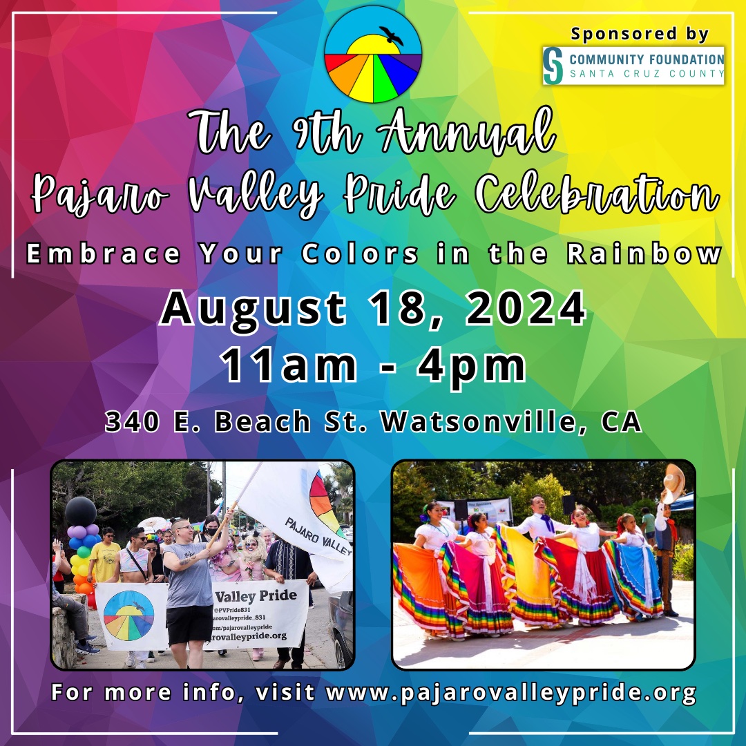 Come enjoy the 9th Annual Pajaro Valley Pride Celebration! There will be local artists, vendors, and food booths plus local LGBTQ+ organizations and great entertainment all afternoon. The Kick-off march starts at 11:30 AM at the YWCA, 340 E Beach St, Watsonville.