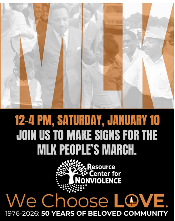 The Resource Center for Nonviolence invites you to gather to make signs on January 10 and march together on January 19, honoring Dr. King’s legacy of nonviolence and love.