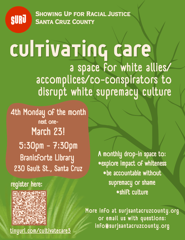 In the spirit of collective, interconnected liberation, the intention of Cultivating Care is to actively build anti-racist culture by understanding and dismantling white supremacy as it exists in ourselves and our culture. While we are clear that we must also work in relationship with Black and BIPOC humans to create new systems where all people are valued and thriving, this group is for being in compassionate relationship with each other to address our whiteness. This container is for all of us, wherever we are on our racial justice journey, to have courageous, vulnerable conversations that foster belonging, healing, calling in and showing up.