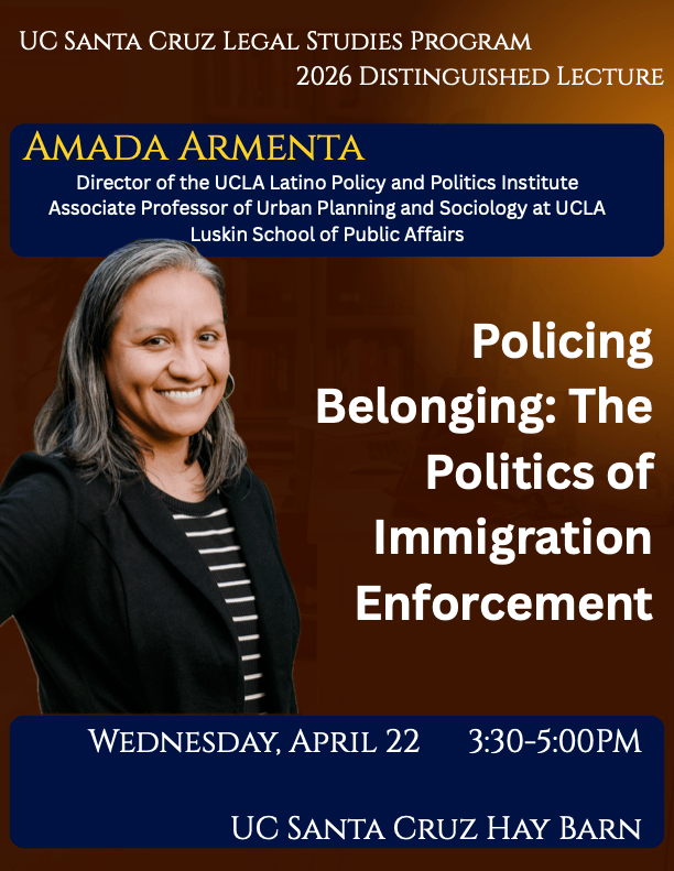 The Legal Studies Program presents: Policing Belonging: The Politics of Immigration Enforcement. This year, we will be hosting Professor Amada Armenta, UCLA Director of Latino Policy and Politics Institute. In this talk, Amada Armenta traces the policy and practice of immigration enforcement in the United States. Drawing on years of qualitative research with police officers, bureaucrats, and undocumented immigrants, she examines how the politics of enforcement are enacted in everyday life—through discretionary decisions, local collaborations, and moral reasoning. Armenta shows how immigration enforcement generates moral tensions for those who carry it out and existential dilemmas for those forced to live within its reach, revealing a system that exposes the uneven burdens of power and belonging.