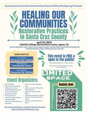 Thursday • April 25 • 6-8 PM • Cabrillo College Horticulture Center • Aptoswheelchair accessible • FREETabling: 5:15-6pm & 8-8:20 pm Join a community forum organized by the Community Corrections Partnership Shared Safety Workgroup: Confirmed Speakers: This event is FREE & open to the public, but space is limited. Reserve your spot now.Registration Link Additional Information: Event Organizers include: Barrios Unidos, CommunityContinue reading “Healing Our Communities: Restorative Practices in Santa Cruz County”