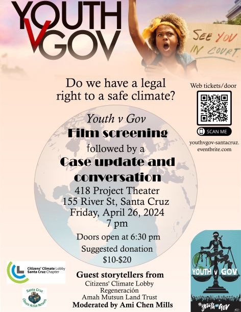 Friday • April 26 • 7:00 PM • 418 Project Theater • 155 River St. • Santa Cruz • wheelchair accessible • suggested donation $10-$20 Citizens Climate Lobby and SC Climate Action Network invite you to a screening of YOUTH v GOV, a powerful climate documentary, followed by up-to-the-minute info on the current status of the groundbreaking Juliana vs. United States case thatContinue reading “Youth V Gov Film Screening”