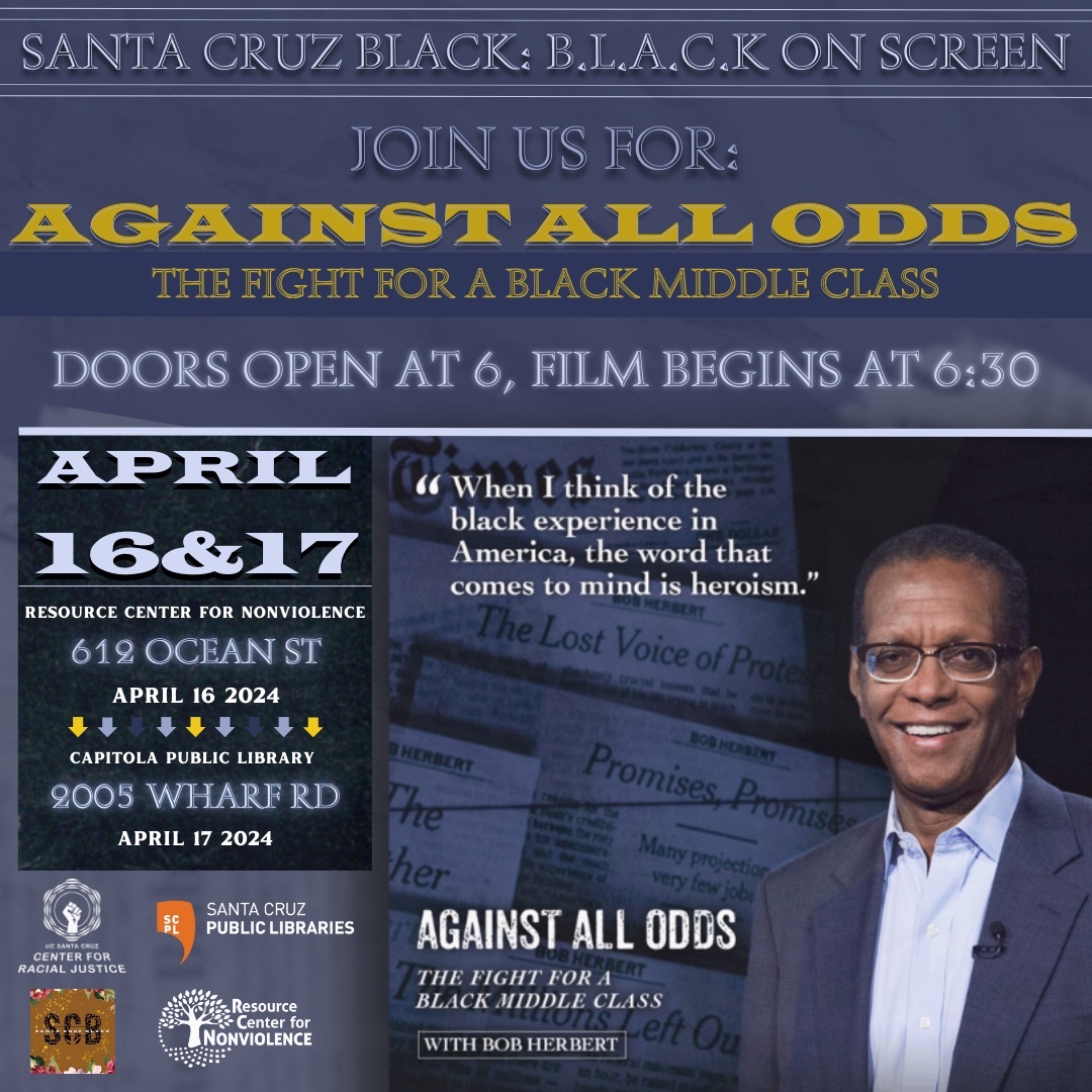 Two Showings:Tuesday • Apr 16 • Resource Center for Nonviolence • 612 Ocean St • Santa CruzANDWednesday • Apr 17 • Capitola Library • 2005 Wharf Rd • Capitola6:30 PM, doors open at 6:00 • FREE • wheelchair accessible B.L.A.C.K. On Screen is a five-documentary film series focusing on the themes behind our acronym BLACK: Building Legacies of Access in Communities of Kinship. Through June, screenings will be the 3rd Tuesday at theContinue reading “Santa Cruz Black Film Series: Against All Odds”