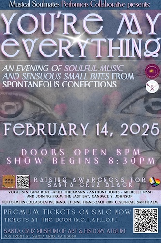 Friday • Feb 14 • 8 PM • Wheelchair accessible • Ticketed event Museum of Art and History • 704 Front St • Santa Cruz n addition to a delightful evening of soulful music and small delicacies, this performance of Musical Soulmates is amplifying awareness about Santa Cruz Black, a local organization dedicated to Black initiatives through community engagement.Continue reading “Musical Soulmates: “You’re My Everything””